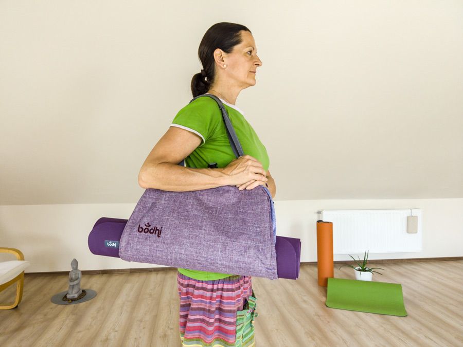 Po rozbalení som ju okamžite vyskúšala. Vložila som ju do môjho obľúbeného vaku na podložku a odvtedy som ju brávala všade, keď som išla cvičiť jogu. Ako maniačka na fialovú farbu som sa tešila, že k fialovému vaku som si našla farebne ladiacu podložku - a takto bola rodinná harmónia dokonalá :).