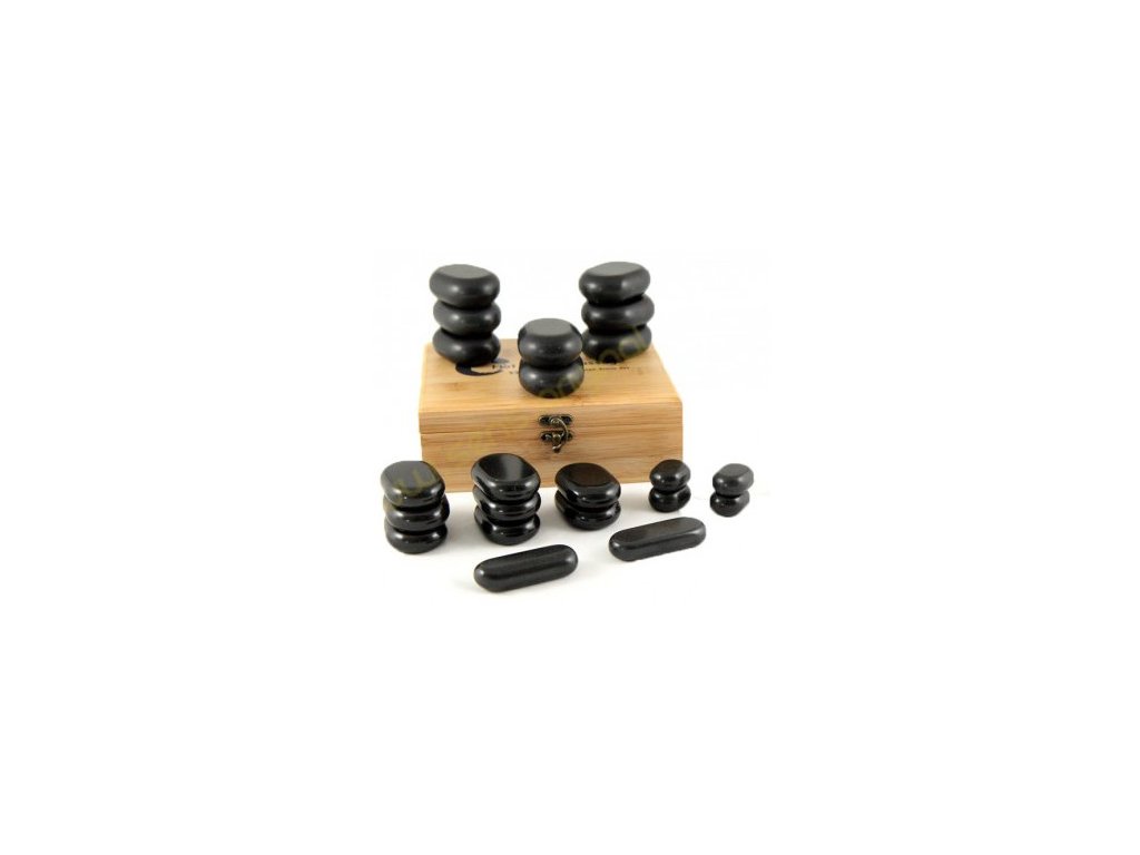 Profesionálna sada lávových kameňov s vysokou tepelno akumulačnou schopnosťou, v bambusovej škatuli, obsahuje 22 čiernych prírodných kameňov sopečného pôvodu v nasledujúcich veľkostiach: