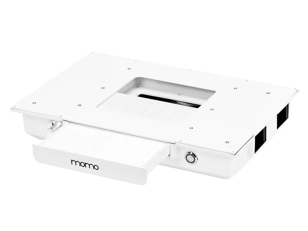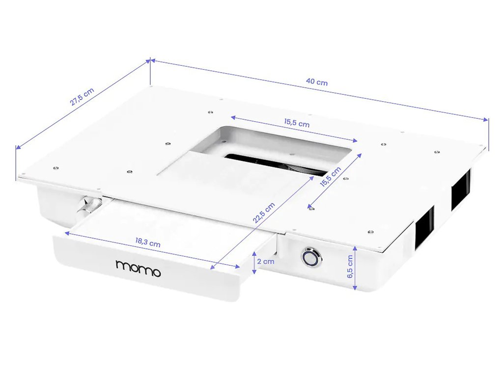 Súčasťou stola je vstavaný kazetový odsávač prachu Momo J-02, ktorý účinne zachytáva jemný prach vznikajúci pri manikúre. Pomáha udržiavať čistý vzduch v miestnosti a znižuje množstvo nečistôt na pracovnej ploche. To prispieva k vyššej úrovni hygieny, lepšiemu pracovnému komfortu a väčšej bezpečnosti pre manikérky aj klientov. Odsávač je navrhnutý s dôrazom na jednoduchú obsluhu a údržbu – pravidelné čistenie a výmena filtra zabezpečujú jeho dlhodobo vysokú účinnosť.